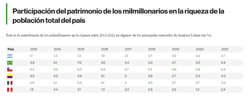 Según la Comisión Económica para América latina y el Caribe el patrimonio de los multimillonarios de América latina llego a 453 000 millones de dólares en 2022, lo que significó un incremento de 4 600 millones dólares más que en 2021.