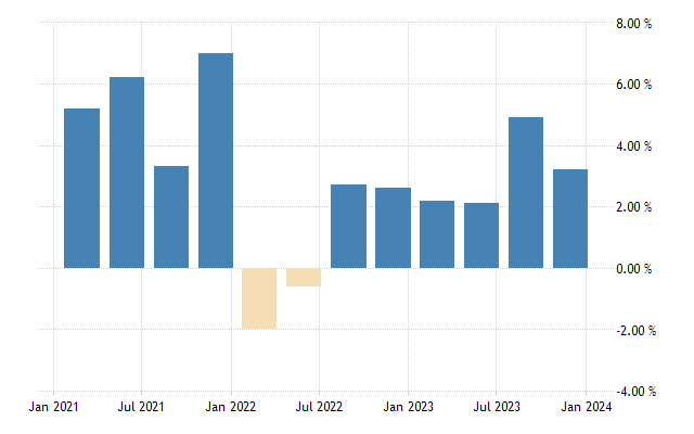 El Producto Interno Bruto (PIB) de Estados Unidos creció a una tasa anual del 3.2% en el cuarto trimestre, en medio de un sólido gasto de los consumidores, confirmó la Oficina de Análisis Económico de Estados Unidos (BEA). Alimentando el buen augurio para las perspectivas de 2024, tras vivir un comienzo débil por el mal clima.